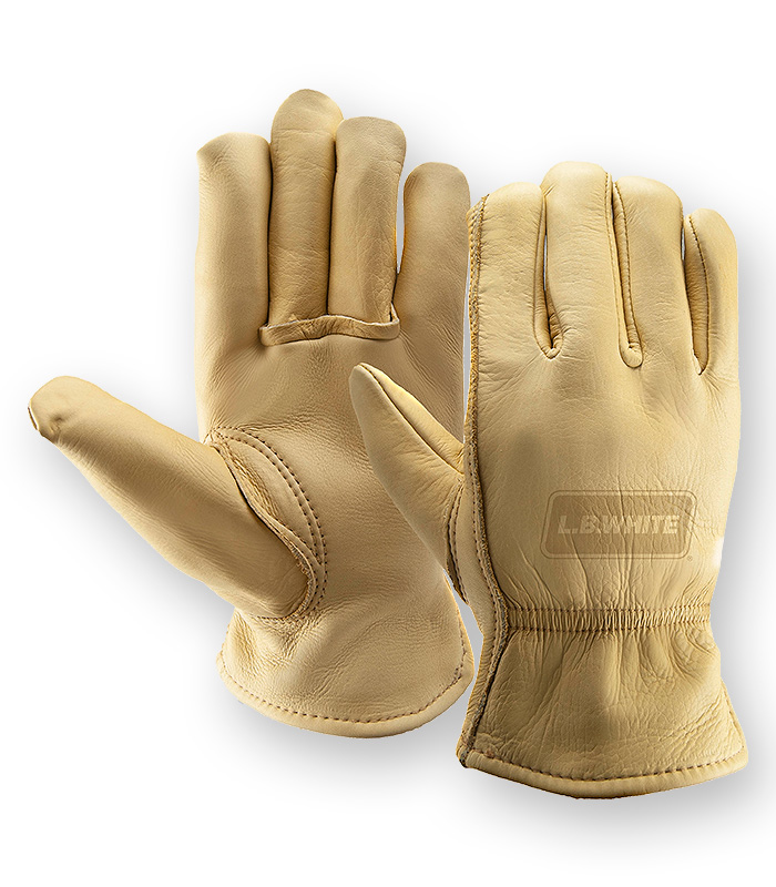 Premium grain cowhide leather work gloves, water-repellent leather, 3M Thinsulate lining, keystone thumb, shirred elastic back. Very soft leather resists soaking. Great for cold storage work, construction, farming, ranching and winter warmth.
